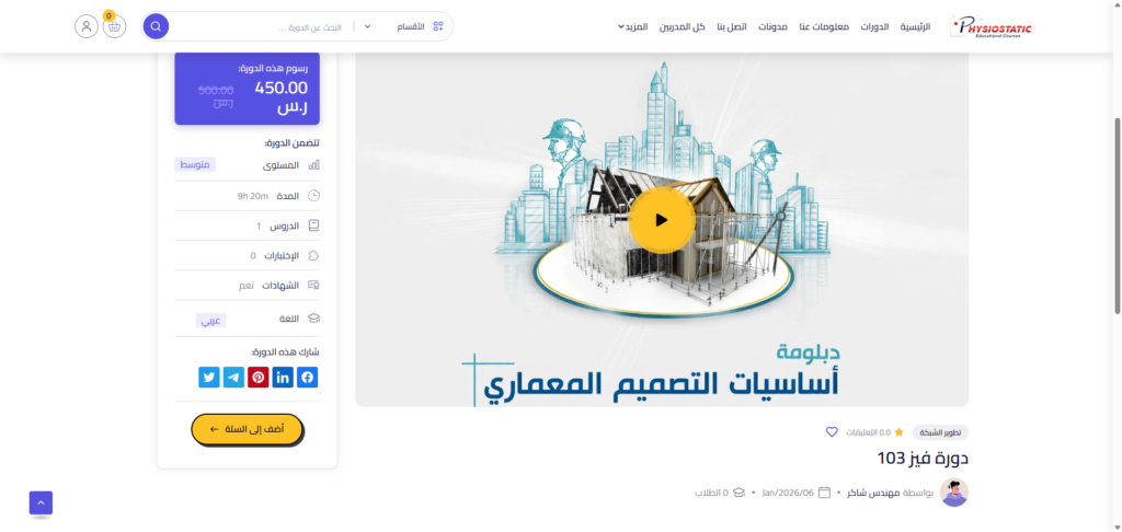 منصة physiostatic للدورات التعليمية المدفوعة والمجانية وتحتوي على 20 بوابة دفع عالمية والدفع أوفلاين وإشتراك الطلاب والمدرسين ولوحة تحكم كاملة للمدير ولوحة تحكم للمدرس ولوحة تحكم للطالب